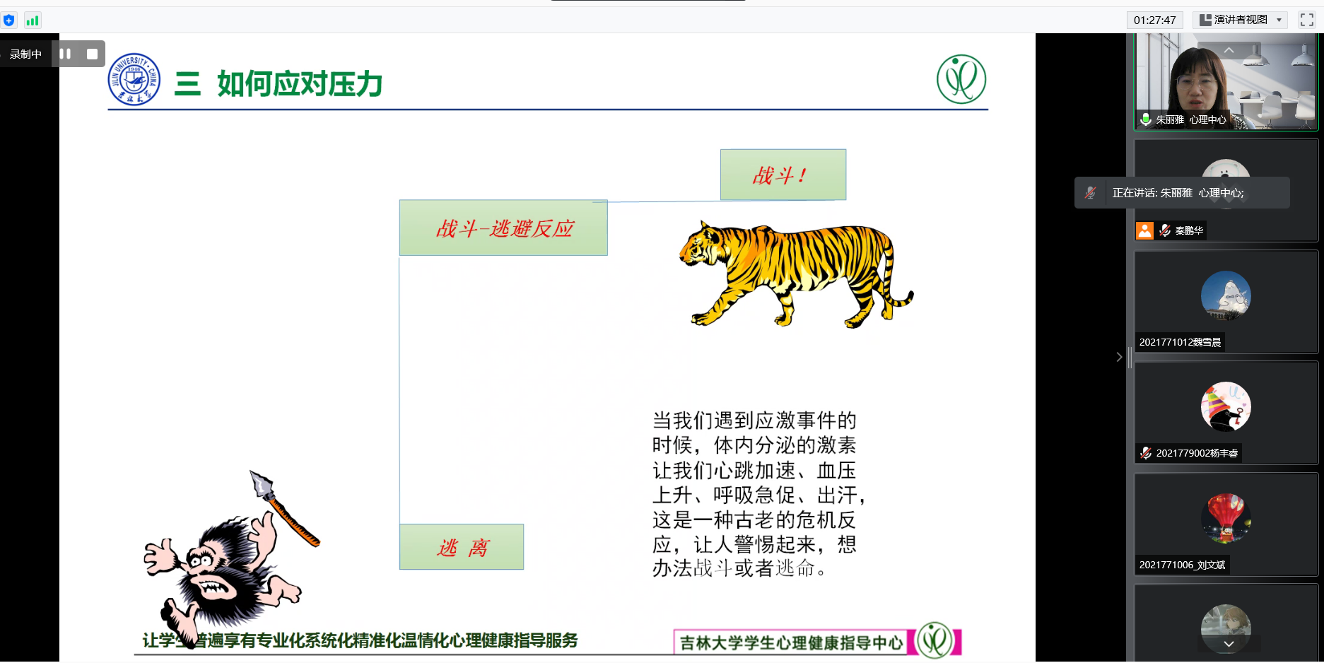 Ms. Zhu Liya, deputy director of the Student Mental Health Guidance Center, shared with students how to cope with pressure and adjust their cognition. To maintain a positive and peaceful state of mind, students should learn to adjust their mindset, talk to others, and seek “off-site support” when they encounter difficulties. The mental health care team of Jilin University aims to provide students with professional, systematic, accurate and warm mental health guidance services.