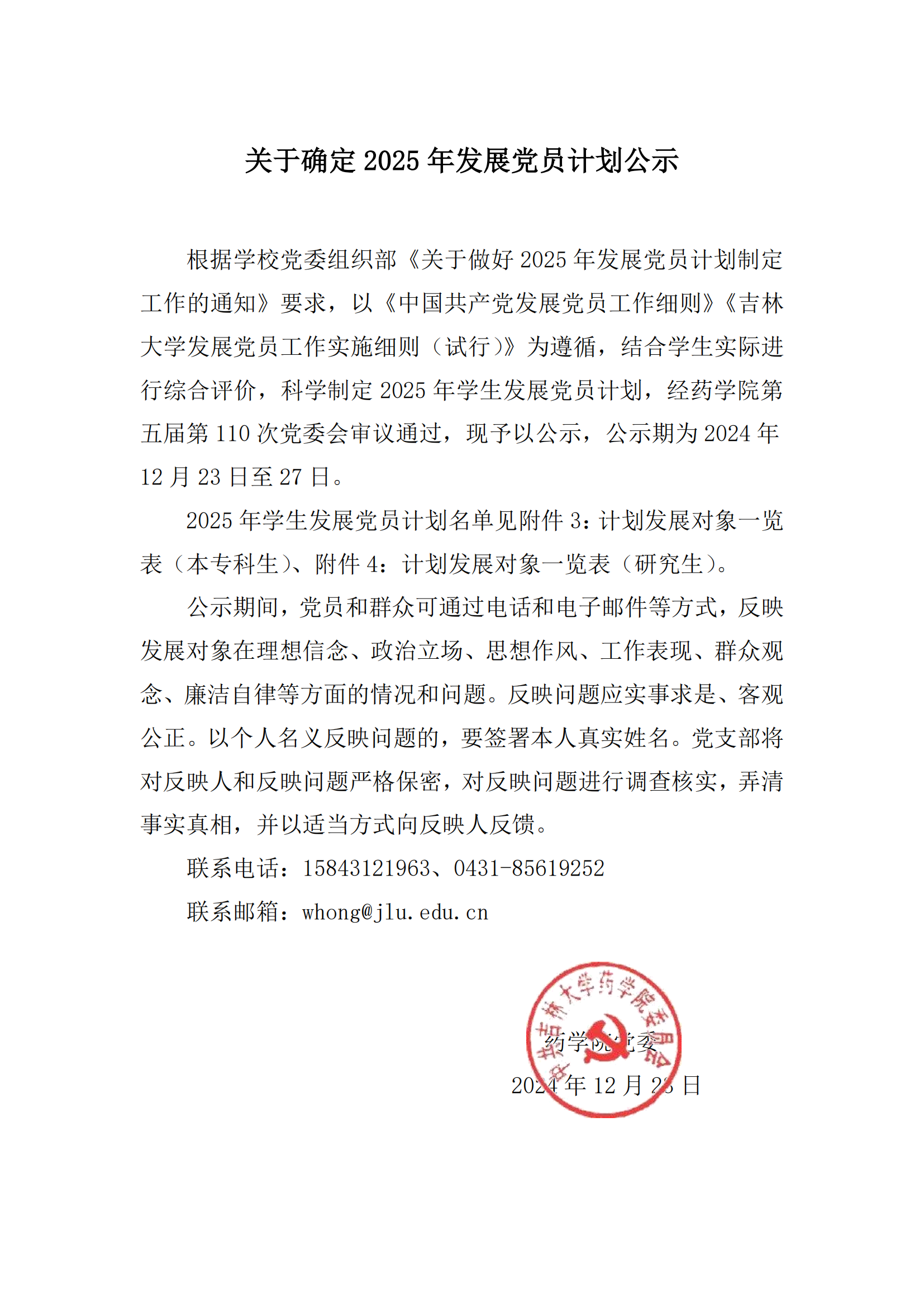 关于确定2025年发展党员计划公示