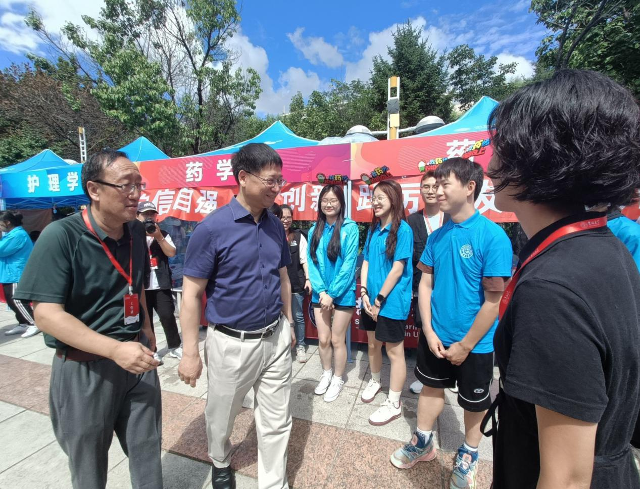 迎新现场,对全体师生的辛苦工作表达了关怀和肯定。同时,学院迎新工作台上富有新意的开学礼盒吸引了张希校长的目光,曲渊立书记向校长介绍了礼盒内容及其背后深刻的含义。