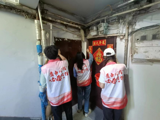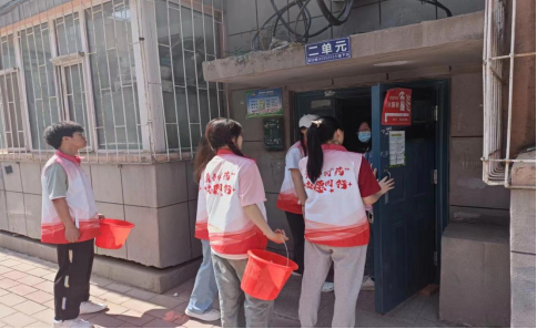 的志愿者们准时来到普庆社区,社区党委书记、党委副书记钱琳琳对大家的到来表示欢迎。钱副书记简单的介绍此次志愿服务活动的工作安排和注意事项后,为同学们分发了清理楼道广告所需的工具。同学们有序地分为8个小组,跟随社区网格员走进社区内的单元楼清理楼道内的小广告。工作过程中志愿者们团结协作,认真负责,不怕麻烦,清理粘贴在楼梯、楼道、液化气管道上的小广告。
