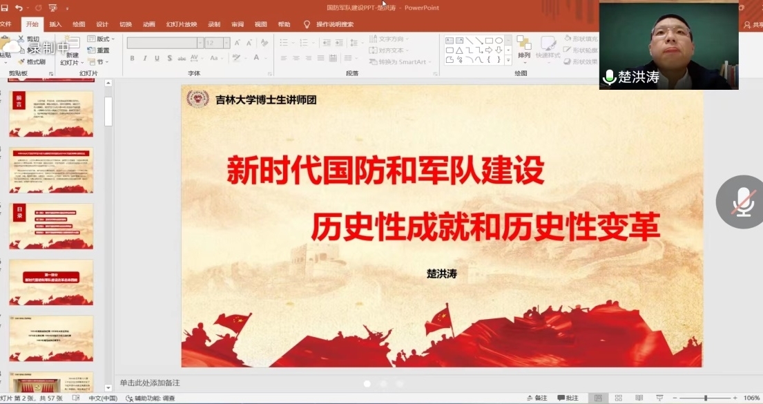 楚洪涛博士首先带领大家对新时代国防与军队建设改革进行了总体回顾,强调了党对军队的绝对领导,并对新时代国防与军队机构改革进行了简述,最后有对新时代我国军事装备方面取得的巨大成就进行了详细的介绍。党的十八大以来,在党的坚强领导下,人民军队实现整体性革命性重塑、重整行装再出发,国防实力和经济实力同步提升,一体化国家战略体系和能力加快构建,建立健全退役军人管理保障体制,国防动员更加高效,军政军民团结更加巩固。人民军队坚决履行新时代使命任务,以顽强斗争精神和实际行动捍卫了国家主权、安全、发展利益。