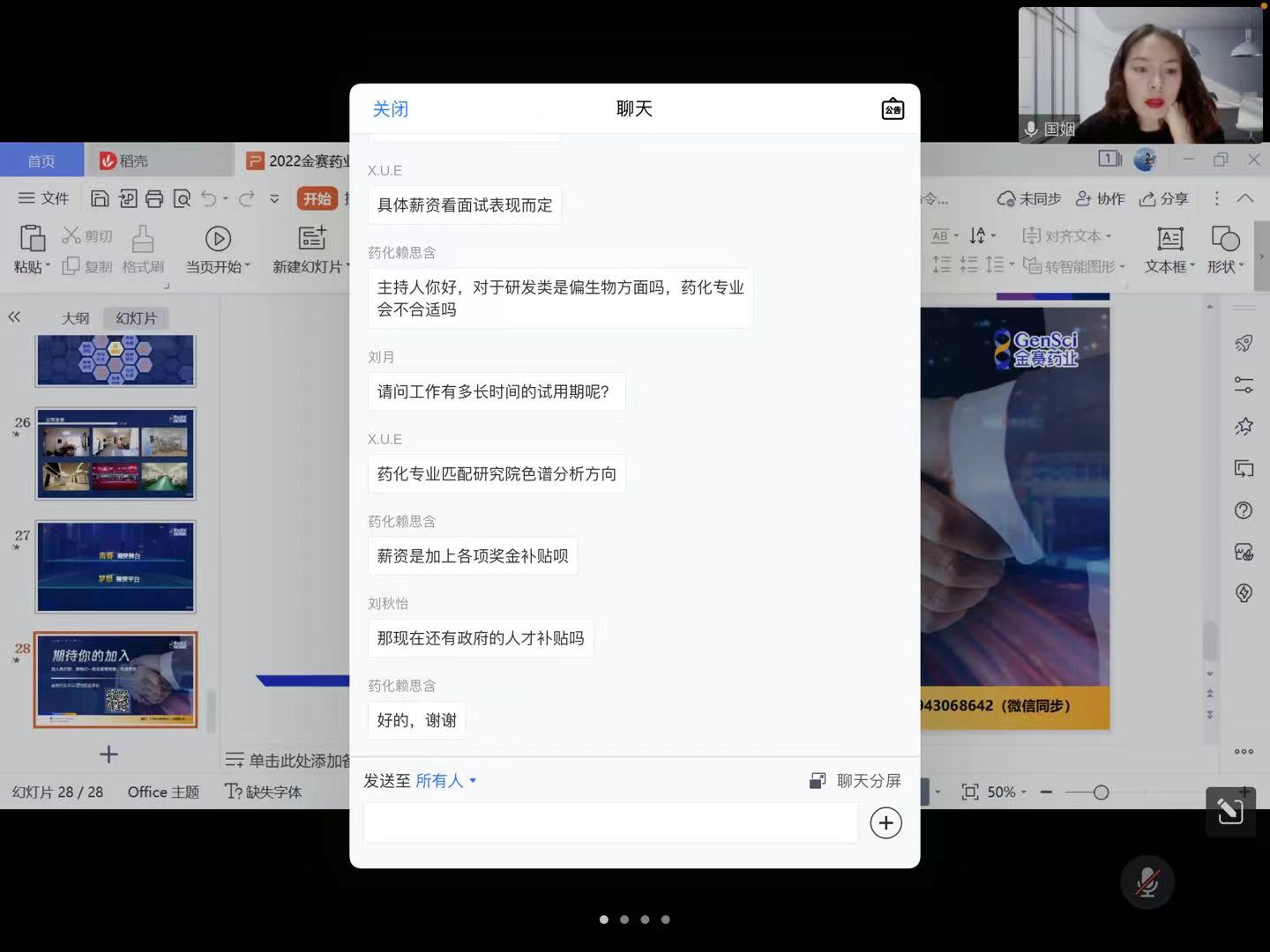 宣讲会开始,金赛药业的主讲人国姻对金赛药业的业内优势进行剖析并对薪资待遇进行简要说明,方便学生对企业有更深一步的了解。随后,她提出了招聘的基本要求,帮助同学们自我衡量,从中找到适合自己的岗位。金赛药业是国内规模最大的基因工程制药企业和亚洲最大的重组人生长激素生产企业,具有良好的就业前景,主讲人国姻根据毕业生就业方面的常见问题详细就公司的招聘岗位、工作内容、工作强度和食宿交通,以及个人未来发展和薪资福利待遇等多方面进行了详细的介绍。宣讲结束后,同学们热情提问,企业招聘部刘宇佳积极解答同学们所提出的问题,如公司加班情况、地方人才补贴金额和岗前培训、公司晋升途径与待遇、福利待遇与要求等,为同学们消除了许多就业方面的困惑,获得同学们的一致好评。而针对应届生择业难的现状,主讲人也给同学们提供了十分宝贵的职业化建议和答疑,希望同学们都能有所收获,期待大家未来都能够找到适合自己的工作,在自己的工作岗位上大放光彩。最后,宣讲会以同学们积极加入招聘群聊完美落幕。