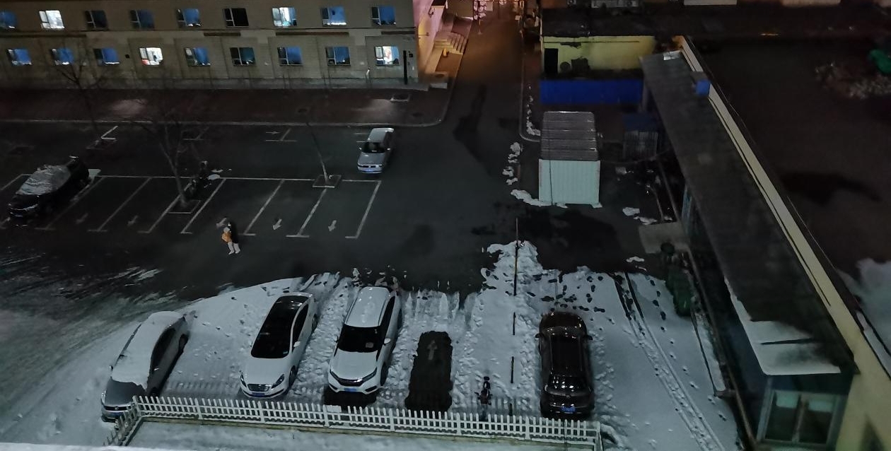 文字说明:物资车走后,耿老师才去栅栏那里搬运物资,本以为她会叫楼里的志愿者们帮忙,没想到她自己抬进楼里了。院子里的雪还未完全融化,我在六楼看着她一步一步挪进11公寓,力气真的蛮大的哈哈!