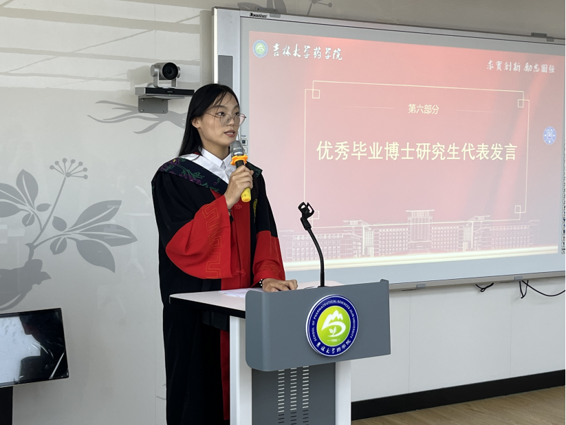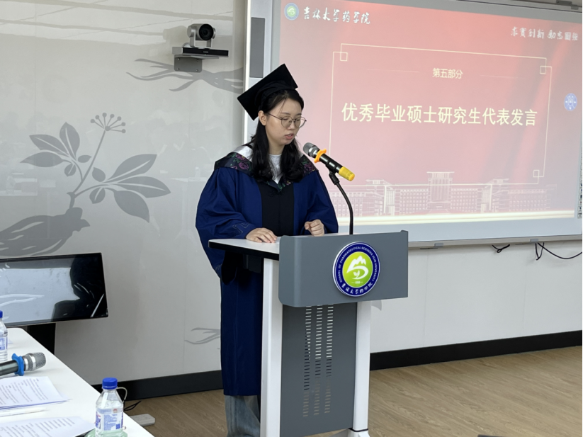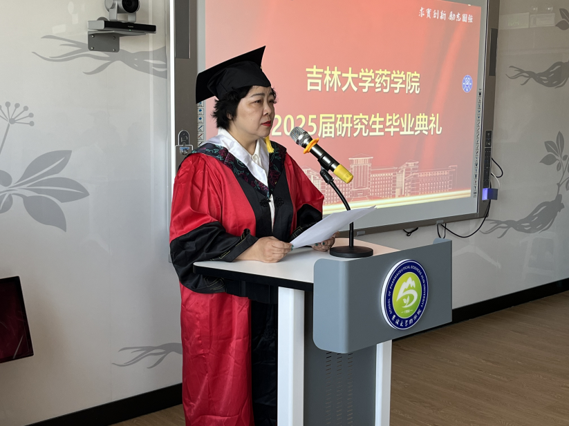 典礼最后,项金宝院长发表致辞。他高度赞扬了毕业生们在科研攻坚中展现的“求实创新、励志图强”的吉大精神,并向大家顺利完成学业表示热烈祝贺。展望未来,项金宝院长勉励毕业生坚定信念、勇毅前行,时刻以“药学人”为荣,勇敢肩负时代重任,为守护人民生命健康、推动中国医药事业蓬勃发展贡献智慧与力量。