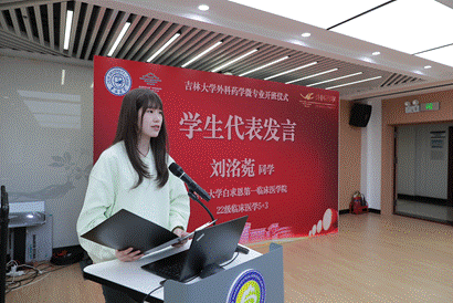 白求恩第一临床医学院 22 级临床医学 5+3 专业的刘洺菀同学分别代表临床药学和临床医学学生发言,从药学生和医学生的不同视角表达了对外科药学微专业学习的认识,期待通过外科药学丰富多样的课程,夯实自己的专业底蕴,实现医学梦想。