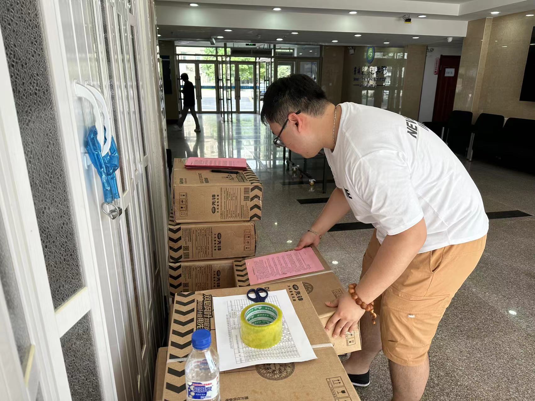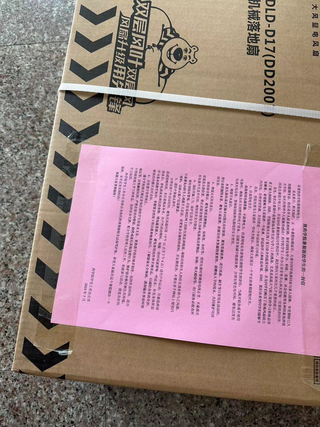 学生工作办公室主任王托带领学生干部为17个寝室的留校同学发放了落地风扇,并在发放过程中了解学生暑期留校学生情况,对暑期留校的安全事项进行了强调,同时在每套风扇的外包装上粘贴了“ 致药学院暑期留校学生的一封信”,信中不仅表达了学院对留校学生刻苦努力的肯定及对大家的亲切关怀,更传达了学院的几个重要的安全提示,围绕“安全用电用水、增强火灾防范意识、严防溺水事故、严防交通事故、严防诈骗、自觉遵守管理规定”等主题进行了安全教育宣传。