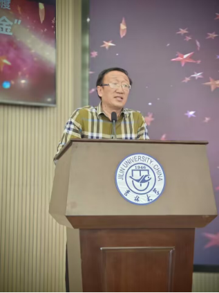 党委书记曲渊立致辞。曲书记在致辞中首先表达了对吉林省博大伟业制药有限公司大力资助的感谢,并向同学们详细介绍了博大伟业制药有限公司及“博大伟业”奖学金设立的意义。此外,曲书记还代表看漫画