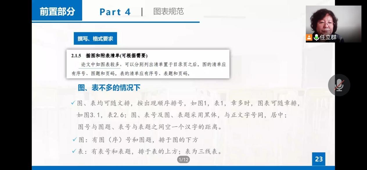 本科毕业论文工作管理办法》中的毕业论文过程管理、考核和成绩评定等进行详细解读。并从选题、实验工作进度安排、毕业论文撰写要求、书写格式包括摘要、目录、引言、正文、参考文献及致谢各环节逐一进行了详细介绍。对各部分常出现问题,采用具体案例法进行分享与讲解。最后任教授鼓励毕业年级同学们认真地完成本科毕业论文,保质保量地完成毕业论文的相关工作。