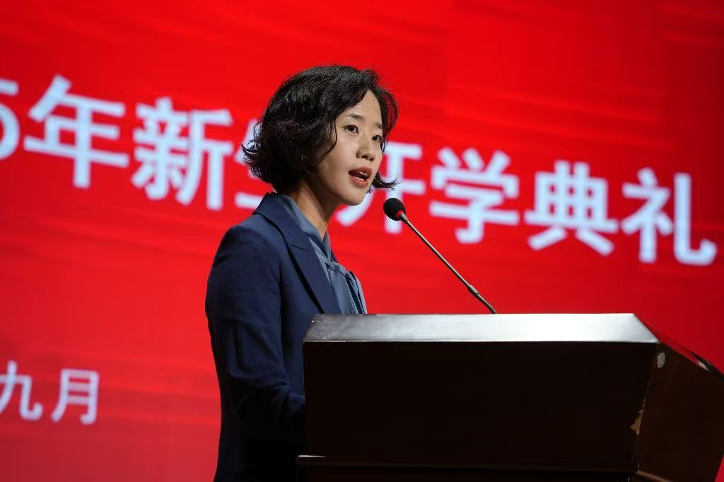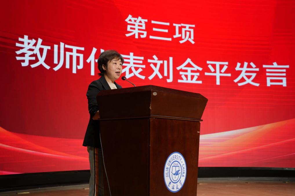 接下来,教师代表刘金平教授发言。刘金平老师首先代表全体教师向新生表示热烈欢迎。她勉励同学们在学业上勤于钻研,扎实掌握基础知识,不断拓展科研视野;在生活中注重自律与修养,学会独立处事与合作共进,保持健康心态。刘金平希望同学们在未来几年能够全面发展,成长为兼具学识、能力与品格的优秀人才。