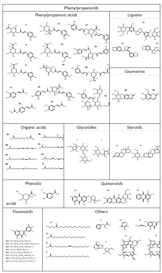 针对这一需求,刘金平教授团队采用UPLC-Q/TOF-MS结合UNIFI平台,系统解析了两种叶片的化学成分相似性,从中共鉴定出75种化学成分,其中69种为共有成分(图1)。另外分别有12种和32种化合物首次从SCL与SFL中被鉴定出来,这些发现为两种五加叶的化学表征及药效物质基础研究提供了重要依据。